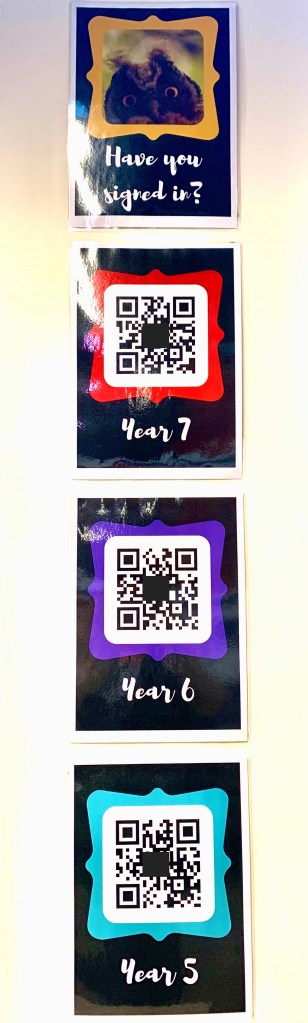 Sounds complicated? Once you have created your first one, you can easily just duplicate and edited your quizzes for each week. I have a little display area where the students go and scan their codes and each week I just stick up the new QR codes. I created the signs using Canva.