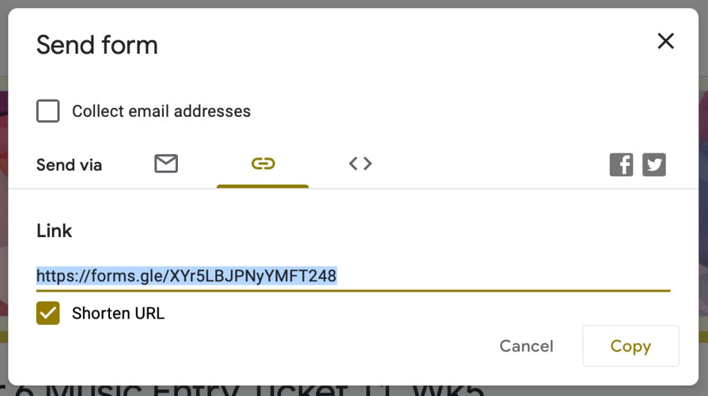 Click on the “SEND” button in your Google Form. Select the link icon and copy the link.